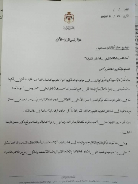 مذكره نيابيه للمطالبه بإنشاء متنفسات آمنه و مسابح للأطفال في الأغوار"