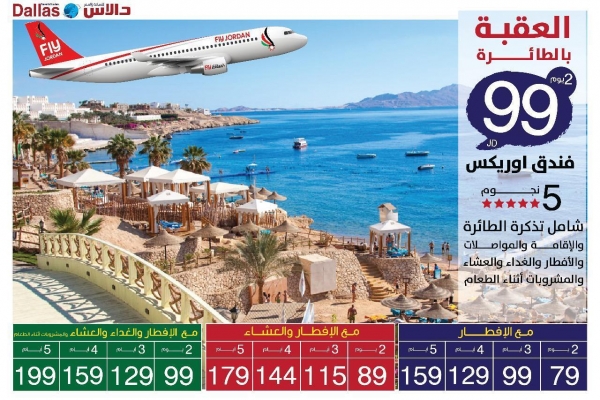 دالاس أول شركة سياحية في الأردن تعلن عن عروض بالطائرة إلى العقبة شاملة لجميع الوجبات