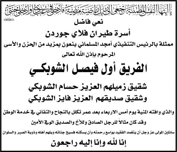 أسرة طيران فلاي جوردن ينعون بمزيد من الحزن والأسى المرحوم بأذن الله تعالى الفريق أول فيصل الشوبكي