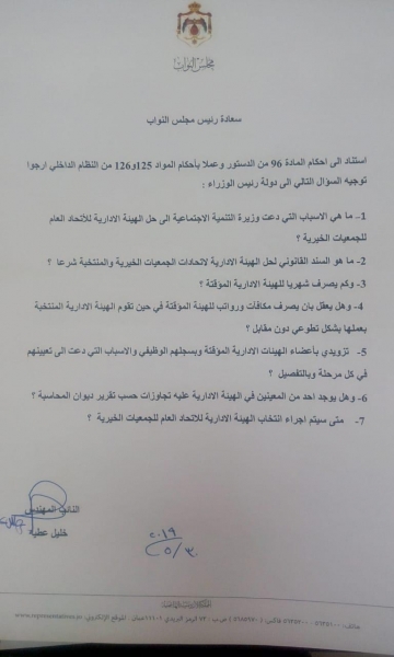 عطية يمطر الرزاز بالأسئلة النيابية حول الهيئة الادارية لاتحادات الجمعيات الخيرية