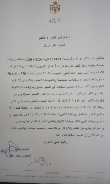 عطية يطالب الرزاز باستكمال اجراءات تعيين ٤٠٠ سائق في امانة عمان