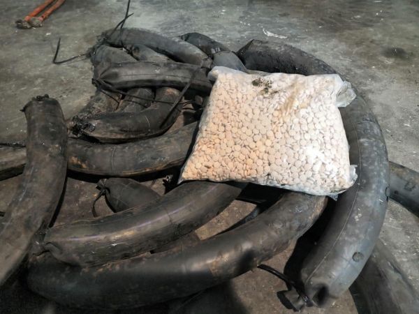 بالصور احباط محاولة تهريب ١٠٠ الف حبة مخدرة اخفيت داخل اطارات مركبة شحن