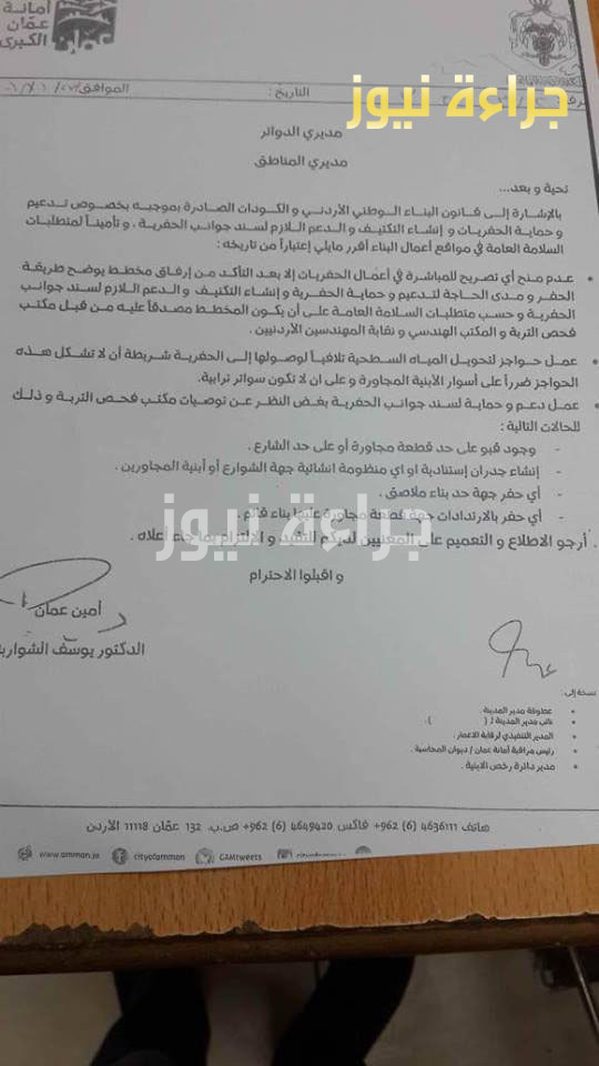 بالوثيقة ..امانة عمان تنشر عبر جراءة نيوز وثيقة تبين الحالات التي يسمح فيها بالحفر والبناء خلال الثلاثة اشهر المقبلة
